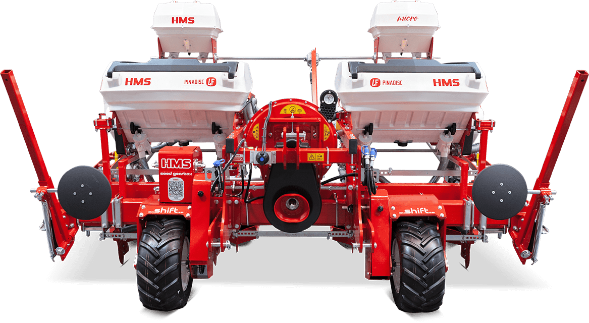 HMS DİSKLİ PNÖMATİK HASSAS EKİM MAKİNALARI her çeşit tohumun hassas olarak, istenilen ekim aralığında ve sıra üzeri mesafesinde ekilmesini sağlar. İsteğe bağlı olarak 4-6-8 sıralı olarak imal edilebilir. Ekici ünitelerde tohum yatağı disk vasıtasıyla açılır. Her ekim ünitesinde özel malzemeden üretilmiş, 2-adet disk bulunmaktadır. Ekici ünitelerin diskli tip olması ve şase önüne takılabilen kesici diskler sayesinde işlenmiş veya yarı işlenmiş sap kalıntıları bulunan tarlalarda çalışabilir. Tekerlekten alınan hareketin ekim ünitelerine iletimi şaft mekanizması ile yapıldığından, sıra üstü mesafelerde hassas ekim yapılabilmektedir. Ekici Ünitelerin her iki tarafında bulunan lastik tekerler sayesinde her türlü toprak şartlarında hassas olarak Derinlik ayarı yapılabilir. Tohum ünite arkasında bulunan V baskı tekerlekleri vasıtasıyla sıkıştırılır. Arka baskı tekerinin uyguladığı basınç ve açı yay vasıtası ile ayarlanabilir. V baskı tekerlekleri toprakta kaymak tabakası oluşumunu önler. Diskli ekim üniteleri erken tavda ekim yapmaya imkan sağlar. Disk ayaklı pnömatik ekim makinaları sırta ekim yapılabilmeye uygundur. Sırtları bozmaz. Tohum yatağı dönerek çalışan diskler tarafından açıldığından sertleşmez. Bitki gelişimine uygundur ve traktöre fazla yük getirmez. Üniteler istenildiği zaman kolayca yol ve iş durumuna geçer. İsteğe göre değişik aksesuarlar montaj edilebilir. Yüksek çalışma hızı ve mükemmel performansı ile zamandan tasarruf ve yüksek verim sağlayan bir ekim makinasıdır.