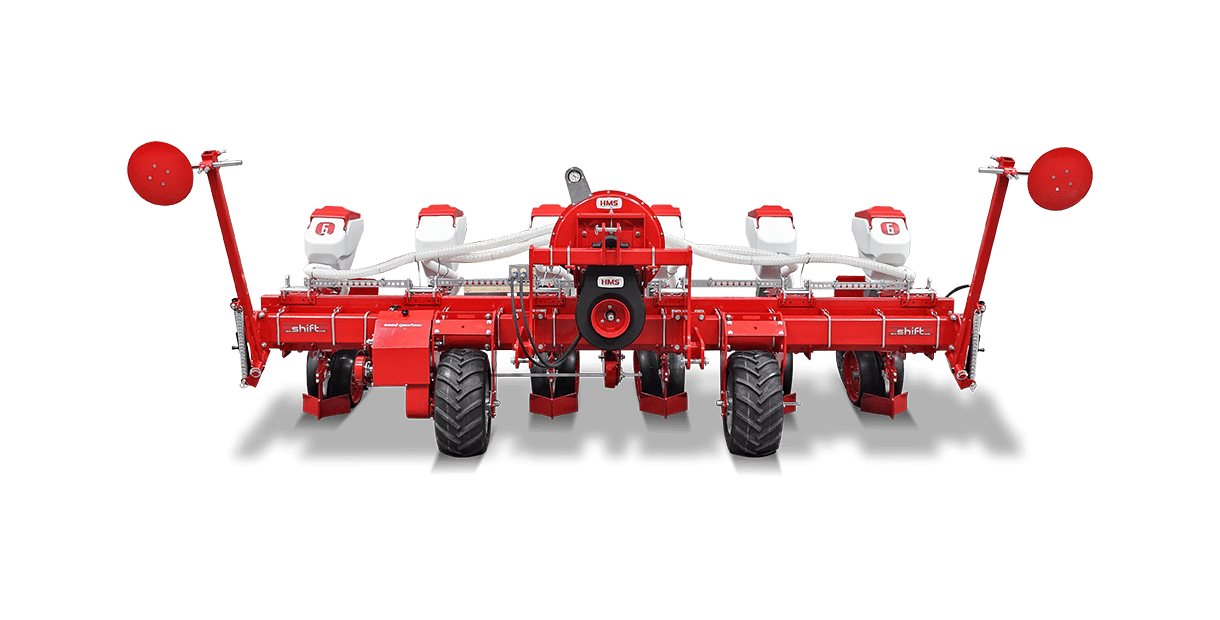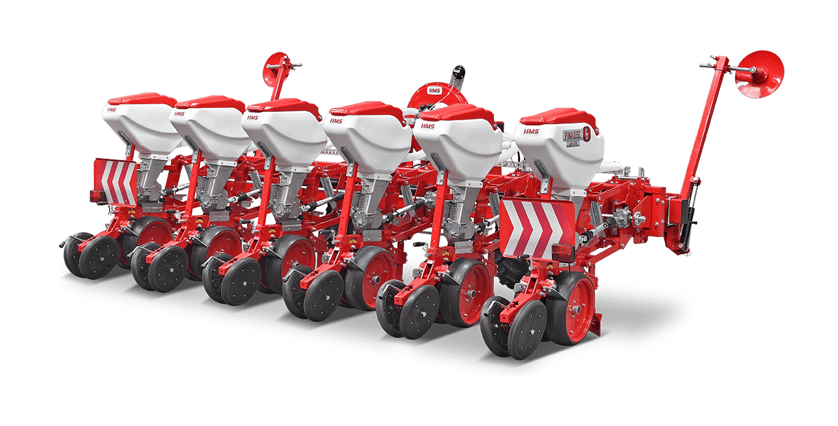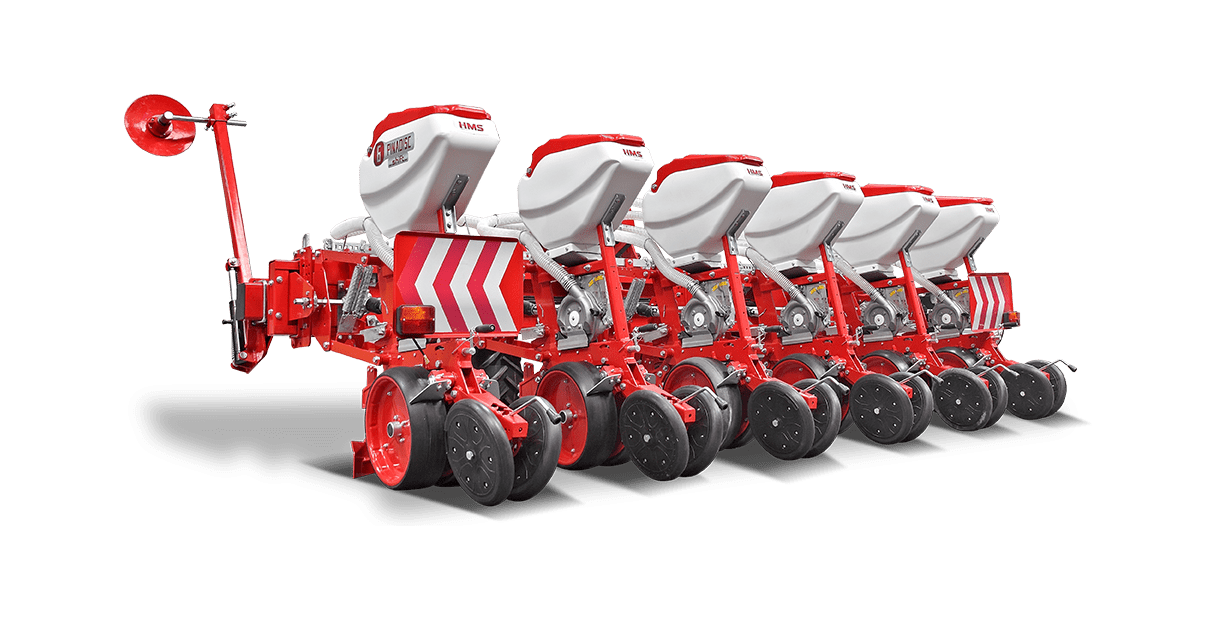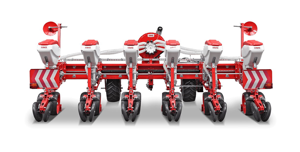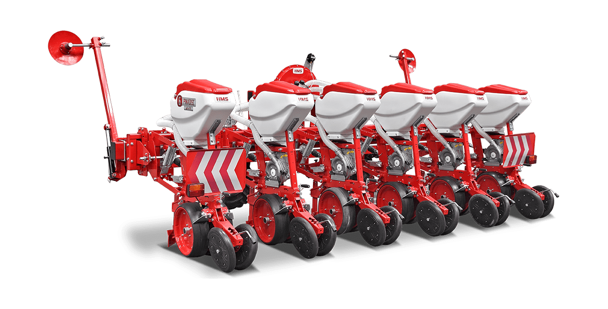 HMS DİSKLİ PNÖMATİK HASSAS EKİM MAKİNALARI her çeşit tohumun hassas olarak, istenilen ekim aralığında ve sıra üzeri mesafesinde ekilmesini sağlar. İsteğe bağlı olarak 4-6-8 sıralı olarak imal edilebilir. Ekici ünitelerde tohum yatağı disk vasıtasıyla açılır. Her ekim ünitesinde özel malzemeden üretilmiş, 2-adet disk bulunmaktadır. Ekici ünitelerin diskli tip olması ve şase önüne takılabilen kesici diskler sayesinde işlenmiş veya yarı işlenmiş sap kalıntıları bulunan tarlalarda çalışabilir. Tekerlekten alınan hareketin ekim ünitelerine iletimi şaft mekanizması ile yapıldığından, sıra üstü mesafelerde hassas ekim yapılabilmektedir. Ekici Ünitelerin her iki tarafında bulunan lastik tekerler sayesinde her türlü toprak şartlarında hassas olarak Derinlik ayarı yapılabilir. Tohum ünite arkasında bulunan V baskı tekerlekleri vasıtasıyla sıkıştırılır. Arka baskı tekerinin uyguladığı basınç ve açı yay vasıtası ile ayarlanabilir. V baskı tekerlekleri toprakta kaymak tabakası oluşumunu önler. Diskli ekim üniteleri erken tavda ekim yapmaya imkan sağlar. Disk ayaklı pnömatik ekim makinaları sırta ekim yapılabilmeye uygundur. Sırtları bozmaz. Tohum yatağı dönerek çalışan diskler tarafından açıldığından sertleşmez. Bitki gelişimine uygundur ve traktöre fazla yük getirmez. Üniteler istenildiği zaman kolayca yol ve iş durumuna geçer. İsteğe göre değişik aksesuarlar montaj edilebilir. Yüksek çalışma hızı ve mükemmel performansı ile zamandan tasarruf ve yüksek verim sağlayan bir ekim makinasıdır.